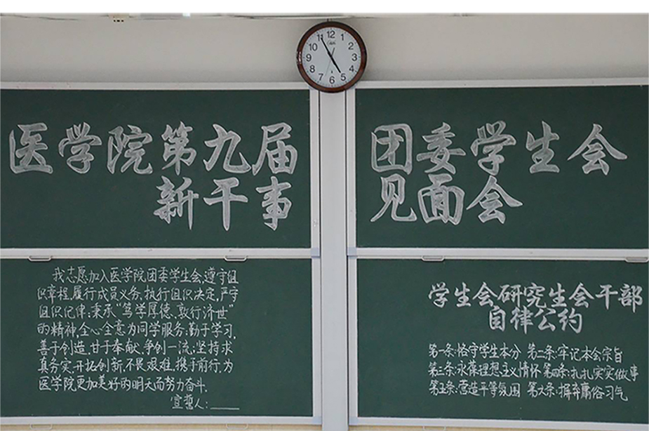 本次大会由医学院第九届团委学生会主席余光华主持。大会伊始,王健副书记致开幕词并对新干事们的加入表示热烈欢迎。书记向新干事们提出了三点要求:一、以身作则,脚踏实地;二、明确定位,回归初心;三、追求卓越,全面发展。同时,书记强调新干事们要树立学生榜样,强化为同学服务的意识。随后,团委书记肖烨姝老师发表讲话。肖烨姝老师希望每一位新干事都能向优秀前辈们学习,在学生会中充分锻炼自我。之后,团委学生会主席余光华宣读《学生会、研究生会干部自律公约》,并希望新干事们能以此规范自身言行举止。此后,主席团各成员向全体新干事分享个人的工作和学习经验,并勉励干事们不断向前。另外,各部门部长轮流上台向干事们简述各自部门的日常工作,同时各部门也依次展示了各自的部门风采。最后,在团委副书记李越男的带领下,全体成员宣誓完毕,自此本次见面会圆满结束。