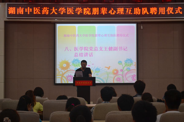 院党总支王健副书记委托做了总结发言。他号召全体朋辈心理互助队员要借助朋辈心理互助平台,发扬团队协作精神,扎实做好朋辈心理互助工作,开展富有特色的朋辈心理互助活动,帮助同学们成为身心健康、人格健全的医学人才,在实际工作中努力做到三点,一是要提高自身素养,领悟“助人自助”的教育理念;二是要增强责任意识,关心、关注和关爱身边的同学;三是要坚持求真务实,深入细致地配合老师做好工作。
