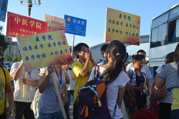 校车刚一驶进青青校园,车上的人还来不及下车,就已被接待组人员积极地围在了校车旁。我院迎接志愿者也迅速跑上前去,他们扯着沙哑的喉咙、大声喊着我院的招牌专业,准备迎接远道而来的新同学,显得是那么的热情与兴奋。