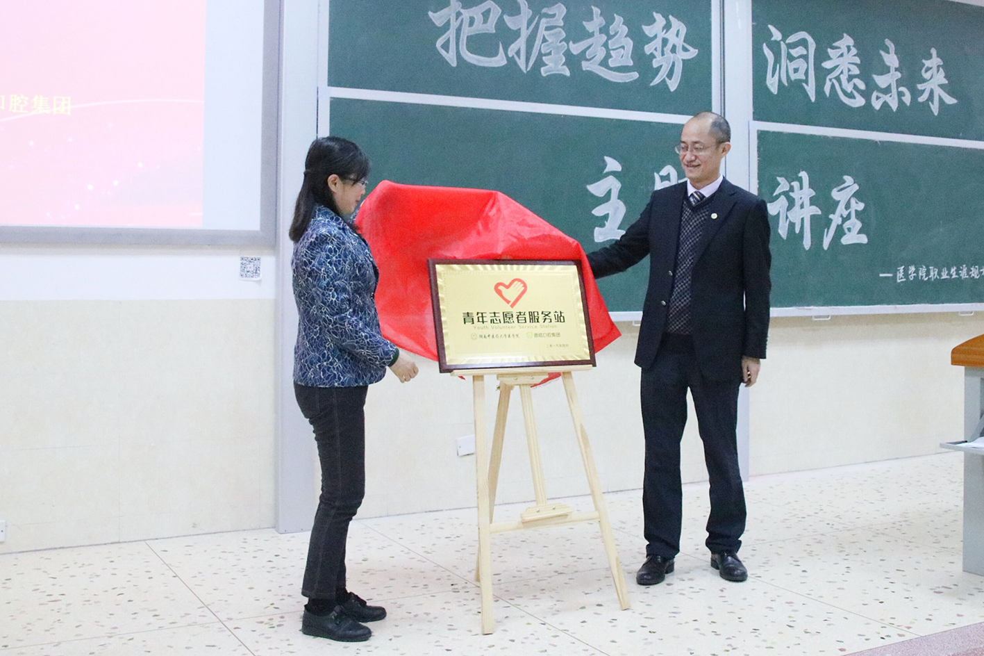 415日晚上7点“把握趋势,洞悉未来”主题讲座暨“德医双馨,皓齿一生”义诊志愿活动启动仪式3116教室顺利举行。此次讲座由德皓口腔集团创始人、董事长毛斌先生主讲,德皓口腔集团联合创始人、执行总裁陈杨志先生及其它管理层人员,与湖南中医药大学医学院党委书记文红艳教授、学生科科长李玉冰老师、团委书记肖烨姝老师以及口腔医学专业学生参与了此次讲座。活动由李玉冰老师主持。