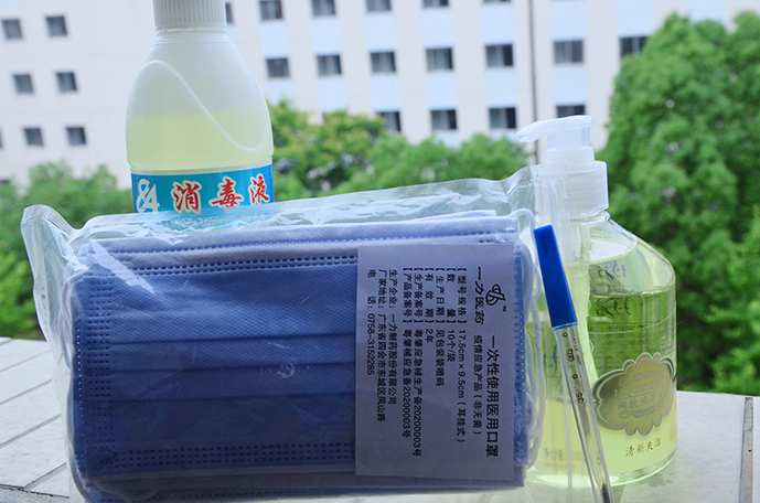 在8号公寓楼下大厅给各个寝室发放了洗手液、体温计、喷壶和84消毒液,并让寝室长在体温登记本每日记录,以便定期定时检查宿舍消毒情况和每位学生的实时体温状况。除此以外,学院还给各个班级发放口罩、额温枪等防疫物资,每班都还需做好病缺课登记,形成寝室长-班团-老师的反馈机制,确保了每位学生的状况能够及时知晓。食堂、教室和图书馆都采取限流的措施,保证人员尽可能的分散。学校医务室也已经准备好大量的防疫物资,一有突发情况,可以立即采取相应的措施。寝室前的黄色标线、食堂旁的洗手池、废弃口罩回收专用桶、学院发放的中药液、楼道内进行空气消毒的艾草等等。学校做了这么多的防疫措施,是为了营造一个安全的校园环境,在返校复课的情况下最大程度的减少病毒入侵的风险。