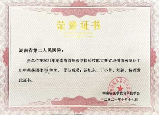 10月16日,湖南省首届医学检验技能大赛在长沙举行。我校医学院2018级医学检验技术专业学生队和附属湖南省第二人民医院职工代表队参赛,分别在领队杨胜辉教授和任碧琼教授的带领下,领队老师尽心尽责、指导得当,参赛选手全力以赴、发挥出色,经过核酸检测防护服穿戴技能大赛、形态学在线大赛以及形态学现场抢答赛等项目的激烈角逐,最终分别获得本科院校学生组和省地州市医院职工组团体二等奖。