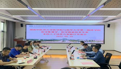 5月25日上午,我院党委书记文红艳、副书记任婷、医学检验专业负责人杨胜辉、学生科副科长廖海燕、诊断学教研室副主任逯晶、第一附属医院放射影像学教研室教学秘书何业文一行6人赴南华大学第一临床学院就医学影像学、医学检验技术一流本科专业建设工作开展考察、调研和交流。调研活动得到了南华附一的热情接待,南华大学第一附属医院党委书记刘江华,党委副书记、副院长祖旭宇,放射学教研室和医学检验教研室主任、秘书、骨干教师代表等人参加了座谈交流。
