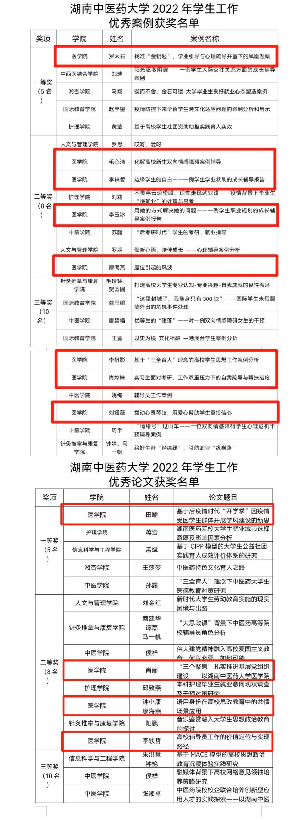 近年来,我院不断健全辅导员成长发展机制,辅导员队伍建设成效明显,屡创佳绩。据悉,在湖南中医药大学2022年学生工作优秀论文评比中,田喻荣获一等奖,肖丽、钟小康、廖海燕、李轶哲荣获二等奖;在湖南中医药大学2022年学生工作优秀案例评比中,罗太石荣获一等奖,毛心洁、李轶哲、李玉冰、廖海燕荣获二等奖;李帆影、肖烨姝、刘娅薇荣获三等奖。