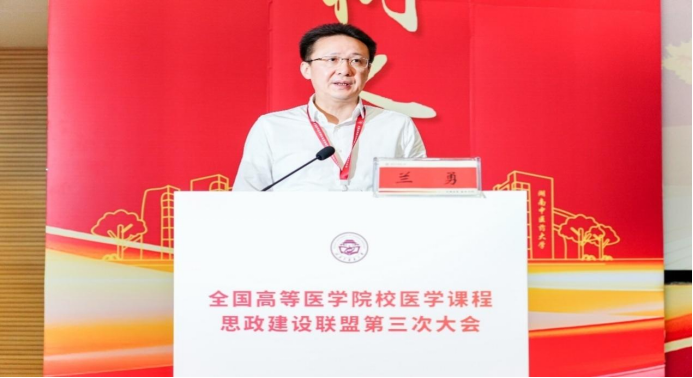 兰勇在讲话中对课程思政提出三点建议:一是要聚焦铸魂育人,构建医学课程思政新体系,进一步推动医学与思政教育深度融合,创新医学人文课程资源;二是要打造医学思政育人共同体,凝聚协同育人合力,以联盟为纽带,促进校际合作与资源共享;三是要服务健康中国战略,彰显医学教育时代担当,以课程思政为纽带,培育更多“下得去、留得住、用得上”的基层健康守护者。