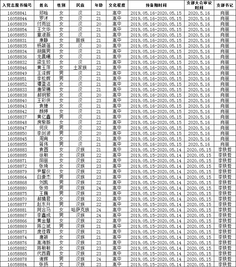 医学院第四、第五学生党支部分别于5月15、16日召开支部大会,同意接收以下47位同志,按期转为中共正式党员,现予以公示,公示期为2020.5.17-5.23日。名单如下: