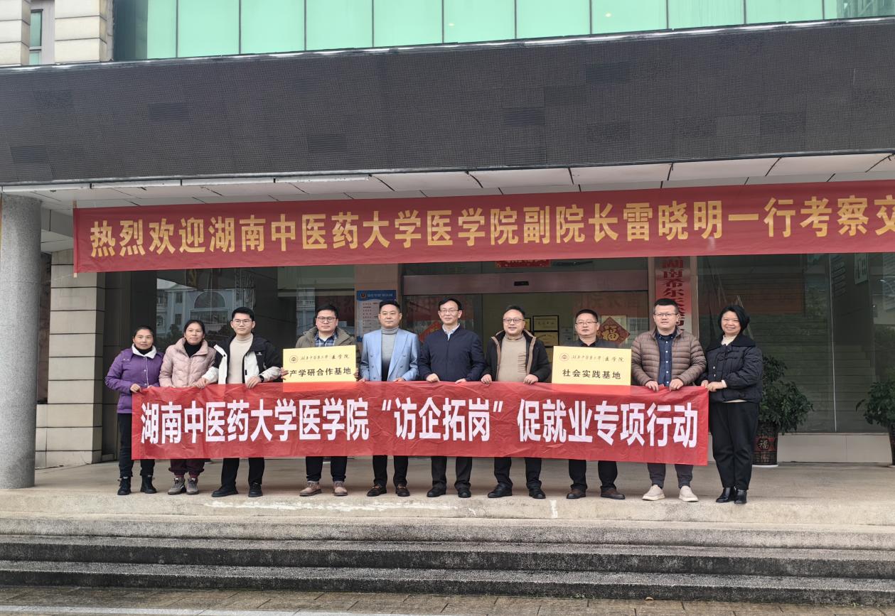 为贯彻落实党中央、国务院关于高校毕业生就业工作的决策部署,加强校企合作,共同搭建人才培养和就业创业的新平台,3月10日,湖南中医药大学医学院赴湖南希尔天然药业有限公司开展访企拓岗专项行动。此次专项行动由我院副院长雷晓明带队,医学院副教授魏科、学生科辅导员李思斌,长沙政兴医疗管理有限公司董事长刘政一同参加。