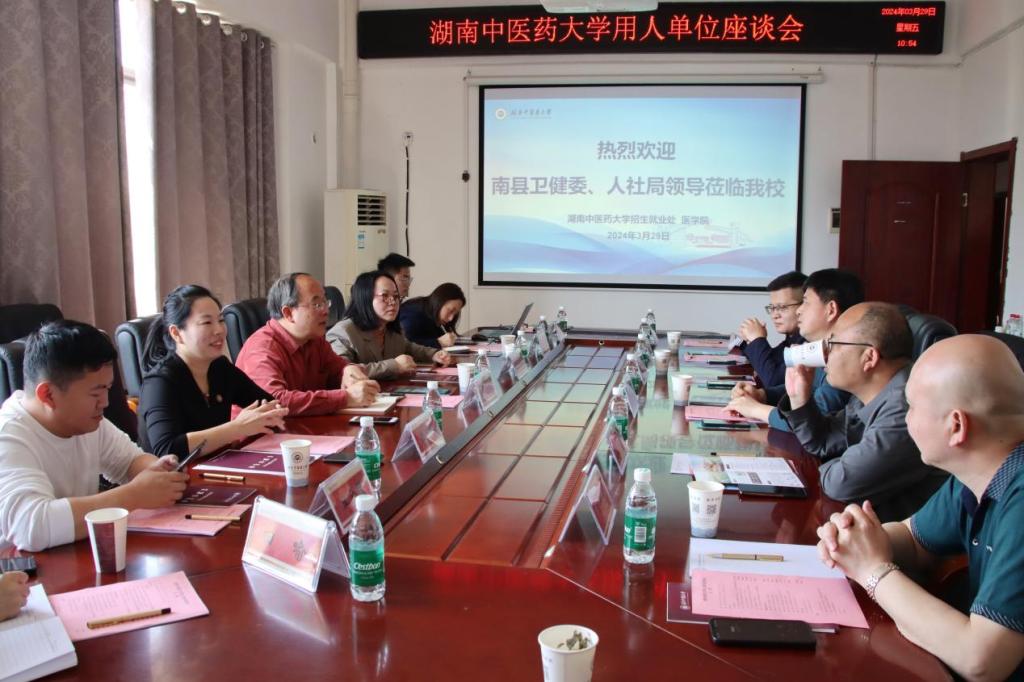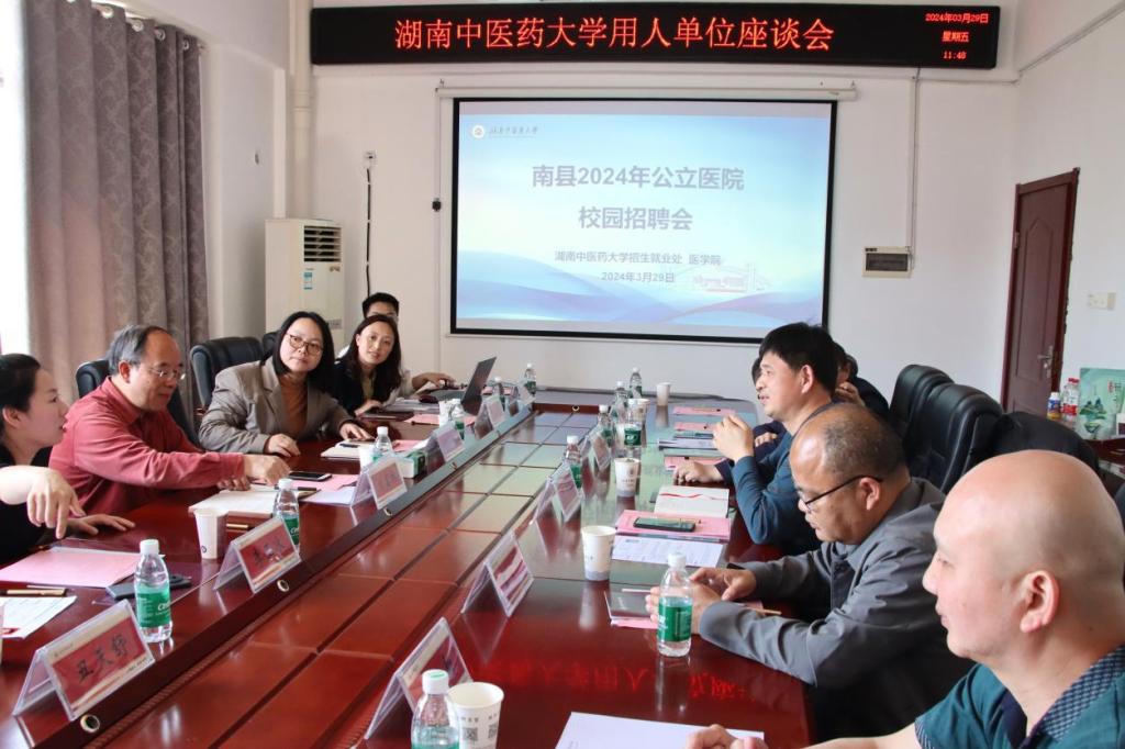为贯彻落实教育部、湖南省教育厅关于“访企拓岗”促就业攻坚行动工作部署,对接基层医疗单位用人需求,拓宽毕业生就业渠道和资源,全力促进毕业生更加充分更高质量就业。3月29日,医学院将南县卫生健康局、南县人力资源和社会保障局等用人单位“请进来”,在含浦校区二办304会议室开展访企拓岗交流座谈会。校党委委员、副校长刘富林、招生就业处副处长杨梅、医学院党委副书记李玉冰、就业指导中心主任邱致燕、医学院学生科科长丑天舒、毕业生辅导员田喻、就业专干吕世豪等参加座谈。