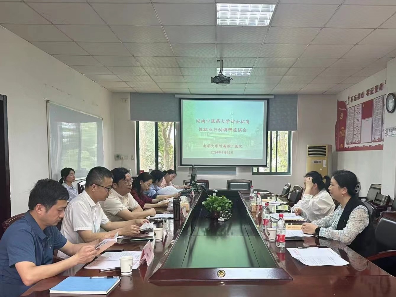 为广泛开拓毕业生就业渠道,加强校企合作,拓展就业新空间,破解学生就业难题,4月15日,湖南中医药大学医学院党委副书记李玉冰与针灸推拿与康复学院有关负责人一行3人来到南华大学附属第三医院开展“访企拓岗”促就业专项行动,并召开调研座谈会。南华大学附属第三医院党委书记左建宏、纪委书记吴小慧、业务副院长熊国祚、院长助理凌伟、徐兵及相关职能科室负责人参加座谈。双方就医院用人需求、毕业生就业情况、学科发展等进行广泛交流。
