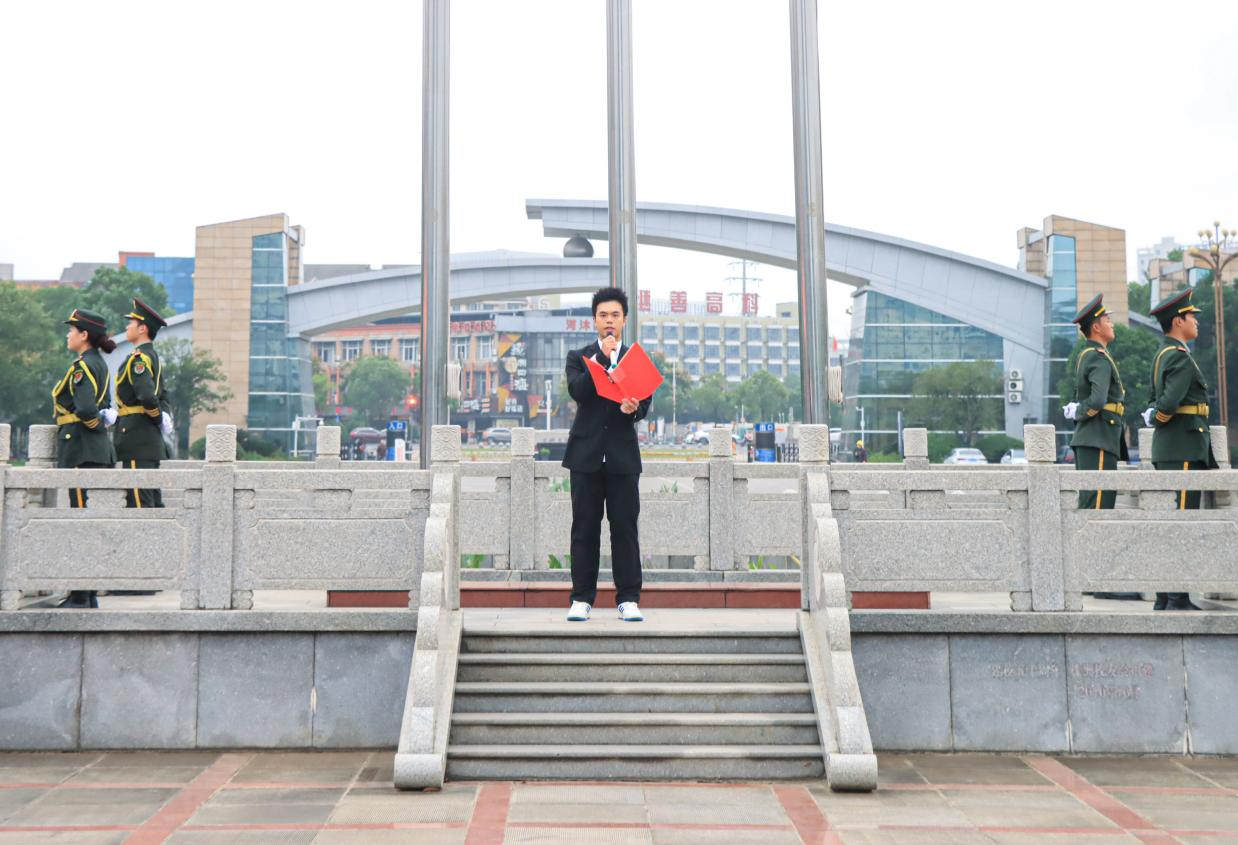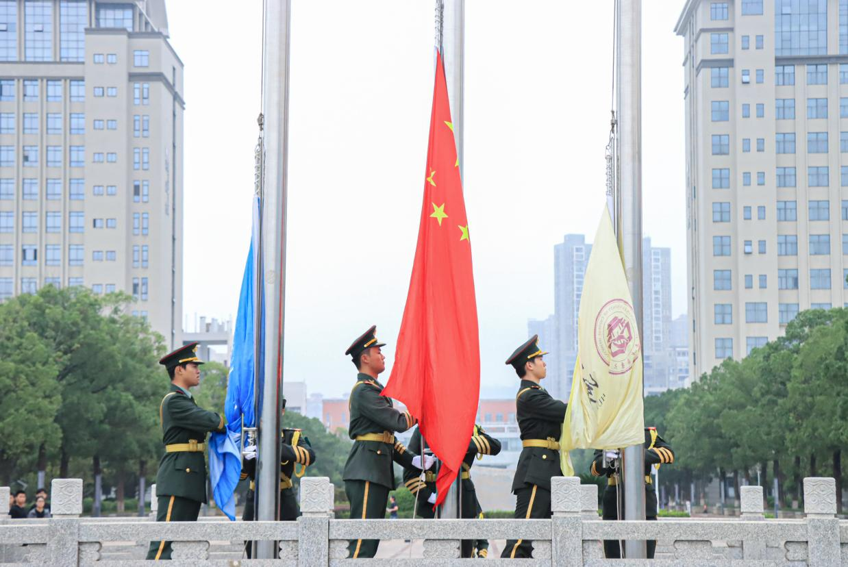 七时整,主持人宣布“升旗仪式现在开始”,现场全体师生肃立。国旗护卫队队员擎举国旗,以庄严正步护送国旗至旗杆下。随后,在激昂的国歌与悠扬的校歌声中,五星红旗与校旗先后冉冉升起,在广场上空迎风飘扬。