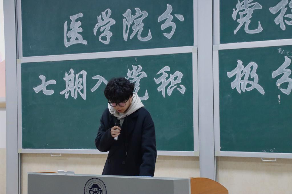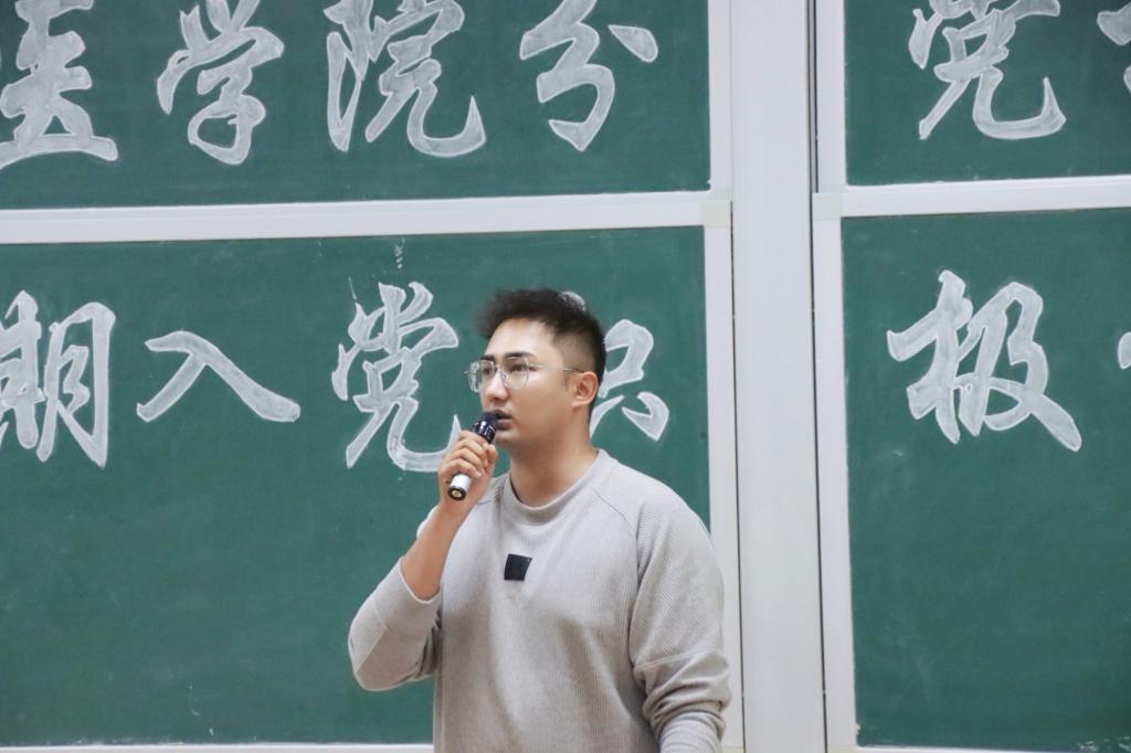 学员代表杨凯翔发言。他表示,作为入党积极分子和医学生,应当做到以下几点:一、深学细悟,筑牢信仰根基,系统把握党的奋斗历程与理论精髓,将书本文字转化为心底认同;二、勤思明辨,把稳行动之舵,在学习中主动求索,不断追问反思;三、知行合一,彰显实干担当,于身体力行中淬炼解决实际问题的能力。