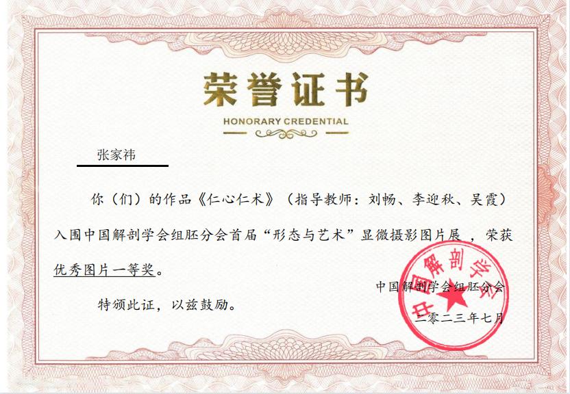中国解剖学会组胚分会2023年学术年会暨第18届全国组织学与胚胎学青年学术讨论会于7月16日-7月19日在遵义医科大学召开,会议期间进行了首届“形态与艺术”显微摄影图片大赛的展览和评选环节。在湖南中医药大学医学院领导的大力支持下,组胚教研室组织并指导学生参加比赛,送选作品10份,最终获得全国优秀图片一等奖一项。