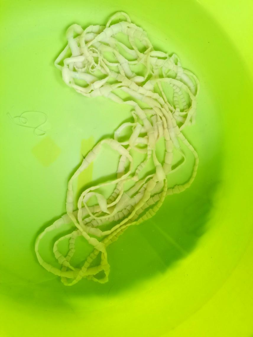 患者排出一条近5米长的绦虫,经过对头节、孕节和虫卵的检测,结合患者近2年喜食生鲜海鲜、生鱼片、腌虾等生食的病史,鉴定为牛带绦虫。杨教授建议,生活中我们为了避免此类症状,应不吃或少吃生食,生熟食的刀具、砧板分开使用,避免造成交叉污染;保持个人卫生,便后用肥皂彻底清洗双手;适当处理动物和人类粪便,减少牲畜接触虫卵的可能;科学饲养宠物,定期给宠物驱虫。
