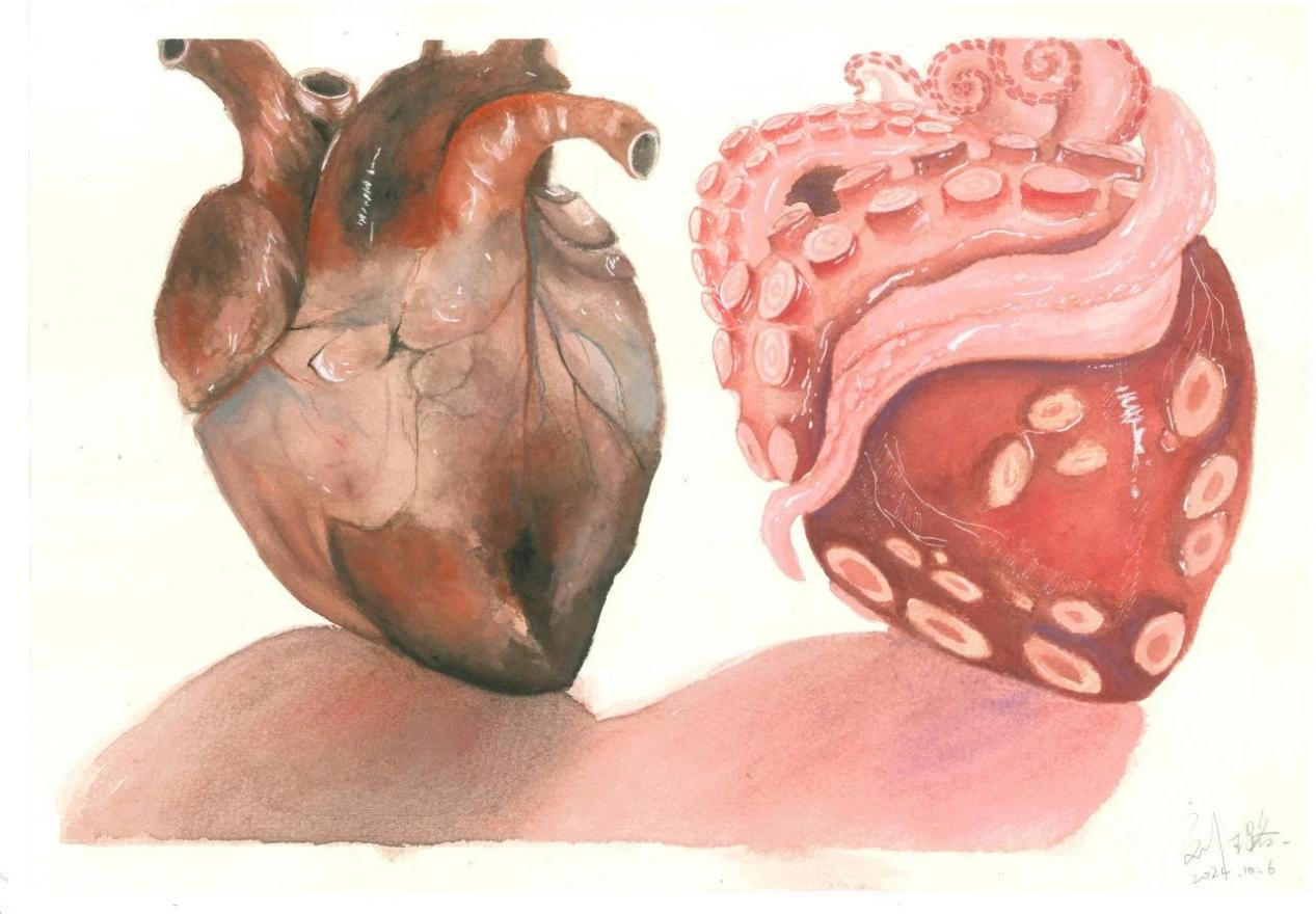 采用与既往不同的绘画思路,刘璐的《两颗心脏》用多重色彩让观者感受到心脏的特殊魅力。浓烈重色相融汇出各心脏结构,藏入蓝色与紫色暗示静脉,避免了红黑单一色调,使画面色彩更加丰富;另一颗心脏更具有魔幻色彩,缠绕着的触手更像是隐喻着心脏与血管之间密不可分的关系,更传达了一个深刻的信息:生命是无数遍色彩也描绘不出的绚烂。