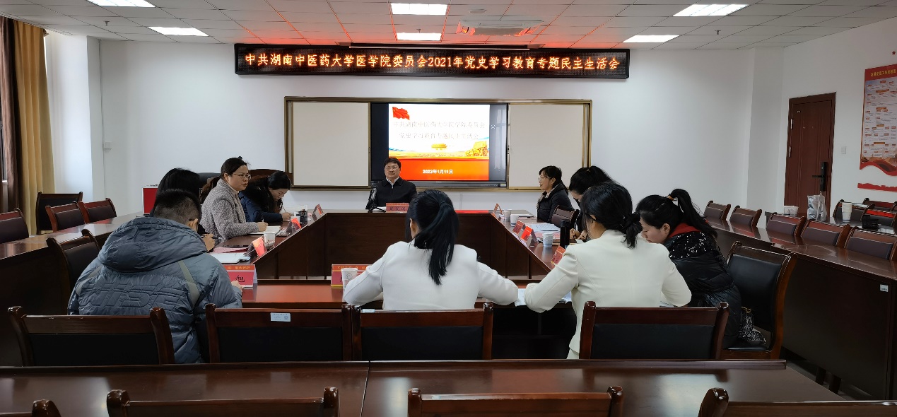 2022年1月11日上午9点,医学院党委在学院会议室召开2021年党史学习教育专题民主生活会,学院党委书记文红艳同志主持会议,校党委副书记、校长戴爱国同志、校党委委员、组织人事部部长焦珞珈同志及医学院党委全体委员出席会议,医学院院长庹勤慧同志列席会议。