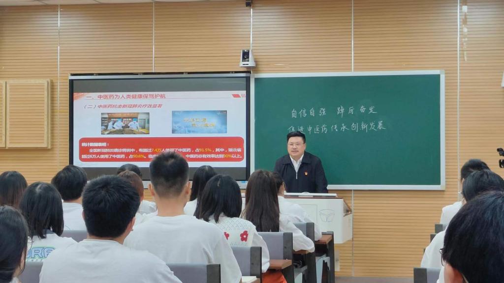 10月25日,校(院)党委书记戴爱国在三号教学楼3300教室作《自信自强,踔厉奋发,促进中医药传承创新发展》的专题报告,医学院师生党员代表60人参加学习。