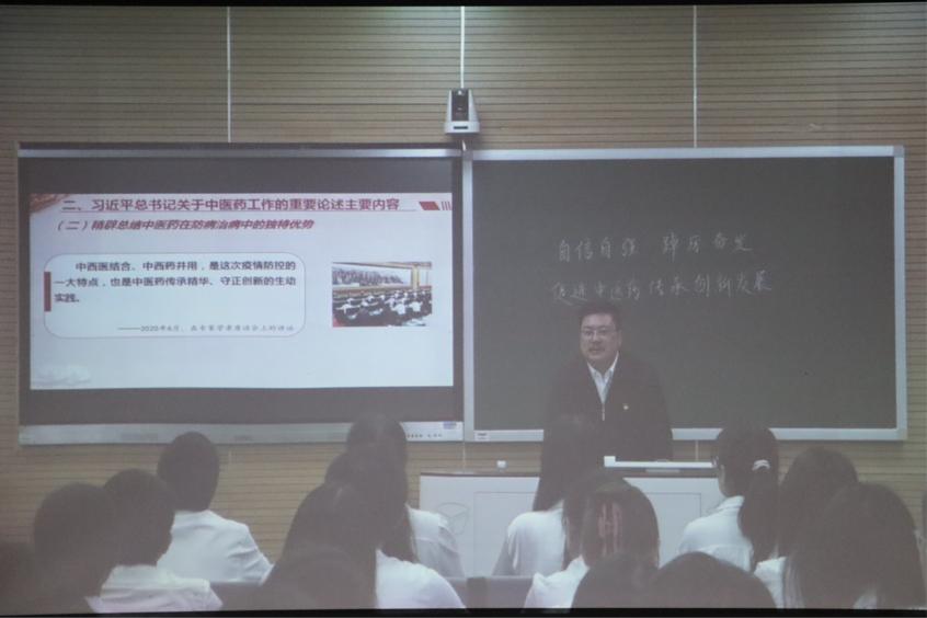 戴爱国将讲解分为中医药为人类健康保驾护航、习近平总书记关于中医药工作的重要论述主要内容、习近平总书记关于中药工作的重要论述当代价值、学校办学有关做法和成效四个方面。他指出:当代中国青年生逢其时,施展才干的舞台无比广阔,实现梦想的前景无比光明。并希望同学们深入学习贯彻习近平总书记关于中医药工作的重要内容,牢记总书记的殷殷嘱托,努力成为堪当民族复兴大任的时代新人。