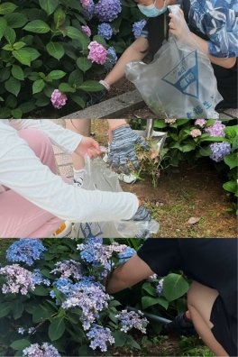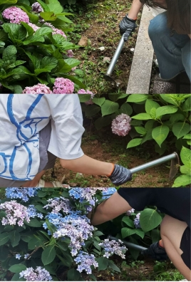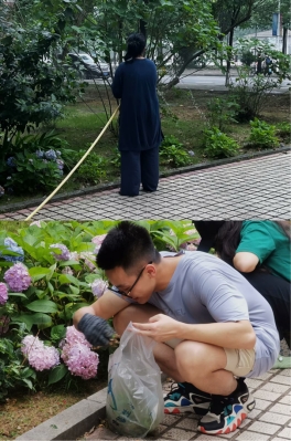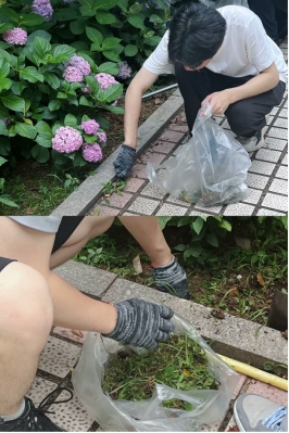 活动当天,同学们拿到除草工具和手套后,按照区域分工分组在A、B实验楼之间的绣球花园开始除草。大家撸起袖子、弯下身,分工合作、埋头苦干,在忙碌中体会着劳动的快乐,经过全体人员的努力,杂草尽除,花园重新焕发出生机与活力。