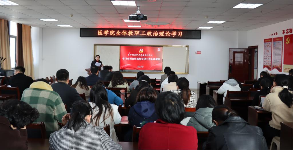 2023年11月14日下午,医学院召开11月份政治理论学习会议,深刻学习全国宣传思想文化工作会议精神及铸牢中华民族共同体意识的重大论述。本次学习活动由学院党委委员雷晓明主持,邀请李玉冰副书记作辅导授课,全体教职工参加学习。