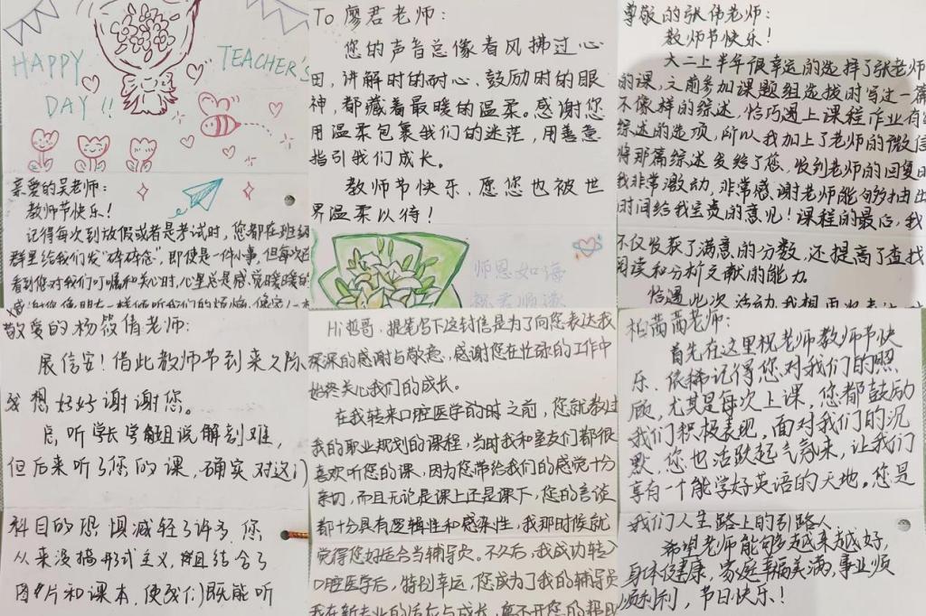 三百余份满载着莘莘学子心意的贺卡,来自于医学院心服部此前发起的“为老师送祝福”特别活动。贺卡内容不仅饱含着同学们对辅导员、班主任及各科任课老师的诚挚感谢,更记录了诸多教学相处中那些温暖而细腻的瞬间,字里行间虽没有华丽的辞藻,却洋溢着发自内心的感激与挂念,不少贺卡除标注所属班级外,还细心署上了姓名与联系方式,为这份心意增添了更具温度的真诚。