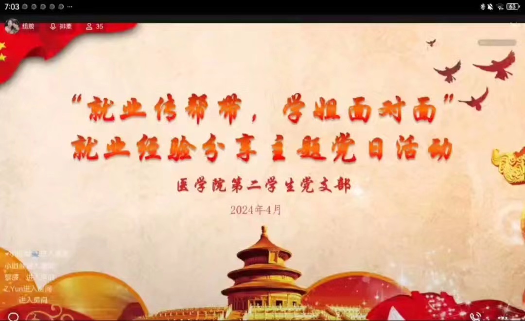 为持续推进“我为群众办实事”实践活动,用心用情帮助毕业生解决就业过程中的急难愁盼问题,医学院第二学生党支部于2024年4月23日晚19点举办“就业传帮带,学长学姐面对面”就业经验分享主题党日活动。本次活动,党支部邀请了2023届毕业生余静和郝婷为支部同志分享就业经验。