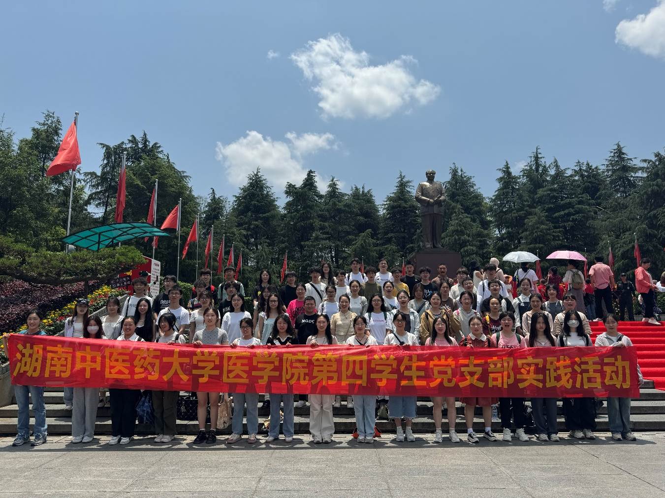 为深入学习贯彻习近平新时代中国特色社会主义思想和党的二十大精神,传承红色革命基因,提高党员干部的四个自信,激发青年一代与时俱进再创新章的底气、骨气与志气。2024年5月25日,由湖南中医药大学医学院本科学生党群服务中心举办的红色实践活动在韶山景区顺利开展。医学院学生科科长丑天舒老师、医学院学生科副科长廖海燕老师、医学院学生科刘娅薇老师及医学院学生四、五支部学生党员、第十四期入党积极分子共计70人参加本次实践活动。