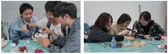 完成参观实践学习后,支部党员返回校园,在党员活动室亲手制作传统簪花,并分组赠予保安、宿管阿姨等后勤工作人员表示感谢。
