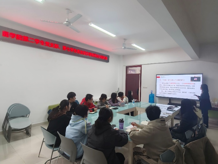 为引导党员深刻把握时代脉搏、筑牢思想根基,2025年12月1日,湖南中医药大学医学院第二党支部与第七党支部在医学院党员活动室联合开展了以《习近平谈治国理政》第五卷为核心内容的专题党课,本次党课由医学院党委副书记刘莉同志主讲,第二学生党支部书记田喻同志主持,支部全体党员共同参加学习。