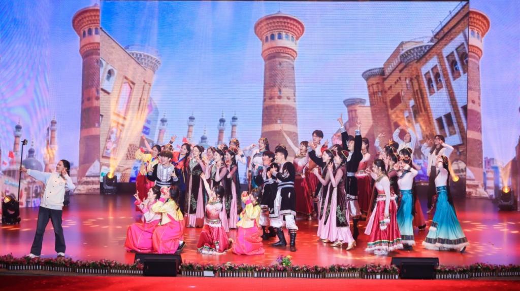 由钟小康、娜飞沙·亚力坤和肖烨姝老师指导,由医学院合欢花工作室、大学生舞蹈队、2022级口腔医学3班、4班同学组成的音乐舞蹈剧《看山看水看中国》获得三等奖。身着朝鲜族、蒙古族、藏族、维吾尔族民族传统服饰的同学们依次登台,用音乐传递民族风情,以舞蹈展现团结友爱,描绘了各民族在中华民族这个大家庭中像石榴籽一样紧密团结的美好景象。