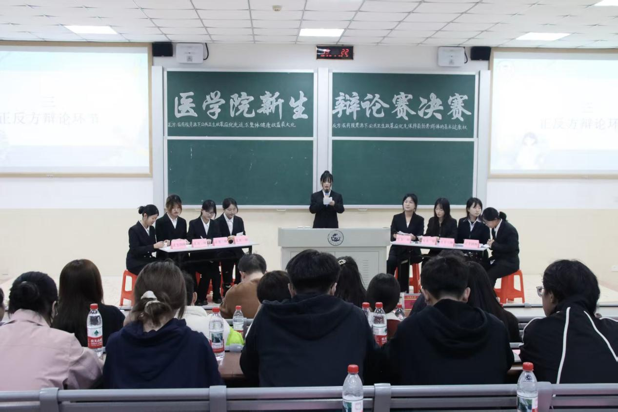赛前,主持人阐述本届新生辩论赛的宗旨:锻炼学生格物致知、探求真理的能力,传承和而不同,君子之争的精神。接着讲解比赛规则并介绍辩题:在有限资源下,公共卫生政策应优先追求整体健康效益最大化,还是优先保障最弱势群体的基本健康权。正方为2025级口腔医学4班,反方为2025级医学影像学1班,在双方辩手进行自我介绍后,主持人宣布辩论赛正式开始。
